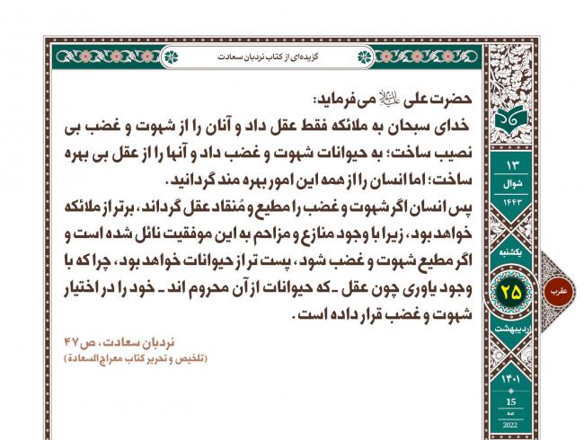 حضرت علی علیه‌السلام می‌فرماید:  خدای سبحان به ملائکه فقط عقل داد و آنان را از شهوت و غضب بی نصیب ساخت؛ به حیوانات شهوت و غضب داد و آنها را از عقل بی بهره ساخت؛ اما انسان را از همه این امور بهره مند گردانید. پس انسان اگر شهوت و غضب را مطيع و مُنقاد عقل گرداند، برتر از ملائکه خواهد بود، زیرا با وجود ...
