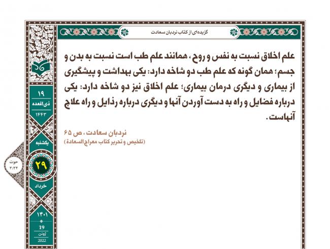 علم اخلاق نسبت به نفس و روح، همانند علم طب است نسبت به بدن و جسم؛ همان گونه که علم طب دو شاخه دارد: یکی بهداشت و پیشگیری از بیماری و دیگری درمان بیماری؛ علم اخلاق نیز دو شاخه دارد: یکی درباره فضایل و راه به دست آوردن آنها و دیگری درباره رذایل و راه علاج آنهاست.   نردبان سعادت، ص ۶۵ (تلخیص و تحریر کت...