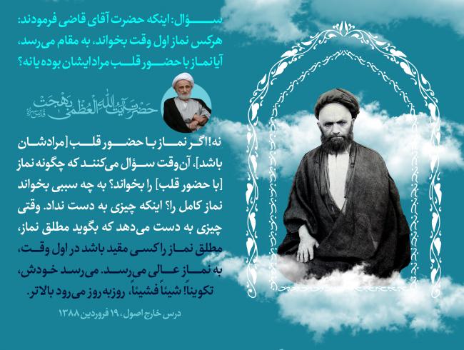سؤال: اینکه حضرت آقای قاضی فرمودند: هرکس نماز اول وقت بخواند، به مقام میرسد، آیا نماز با حضور قلب مراد ایشان بوده یا نه؟