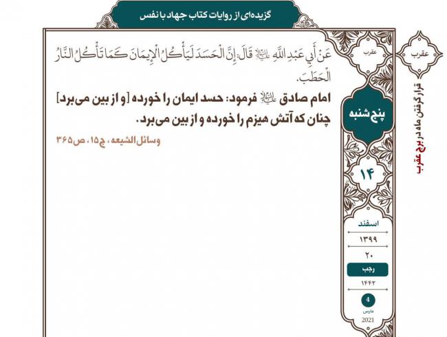 [بر هر مسلمانی لازم است] در هر شبانه روز، یک بار با نفس [خود] شرط کند و از او عهد و پیمان بگیرد که پیرامون معاصی نگردد. چیزی که موجب سخط الهی باشد، از او صادر نشود. در طاعات واجب کوتاهی نکند، و هر عمل خیری که برایش میسر شود ترک نکند.