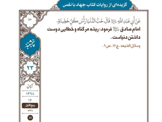 «هر روز سعی کنید یک حدیث از کتاب جهادبانفس را مطالعه کنید و سعی نمایید به آن عمل کنید؛ بعد از یک سال خواهید دید که حتماً عوض شدهاید؛ مانند دارویی که انسان مصرف کند و بعد از مدتی احساس بهبودی میکند».