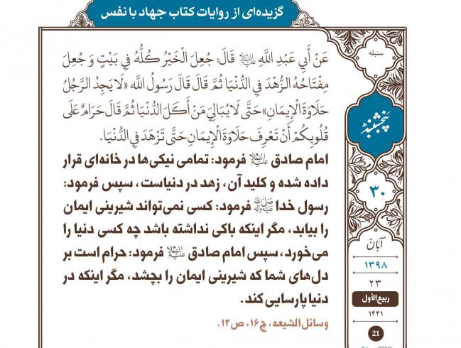 امام صادق علیهالسلام فرمود: تمامی نیکیها در خانهای قرار داده شده و کلید آن، زهد در دنیاست، سپس فرمود: رسول خدا صلیاللهعلیهوآله فرمود: کسی نمیتواند شیرینی ایمان را بیابد، مگر اینکه باکی نداشته باشد چه کسی دنیا را میخورد، سپس امام صادق علیهالسلام فرمود: حرام است بر دلهای شما که شیرینی ایمان ...