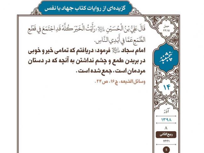 امام سجاد علیهالسلام فرمود: دریافتم که تمامی خیر و خوبی در بریدن طمع و چشم نداشتن به آنچه که در دستان مردمان است، جمع شده است.