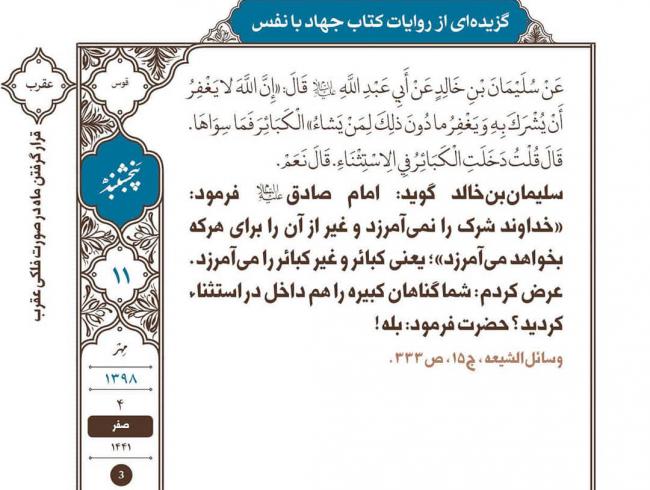 «هر روز سعی کنید یک حدیث از کتاب جهاد با نفس را مطالعه کنید و سعی نمایید به آن عمل کنید؛ بعد از یک سال خواهید دید که حتماً عوض شدهاید؛ مانند دارویی که انسان مصرف کند و بعد از مدتی احساس بهبودی میکند».