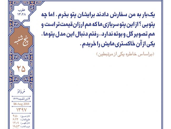 یک‌بار به من سفارش دادند برایشان پتو بخرم. اما چه پتویی؟ از این پتو سربازی‌ها که هم ارزان‌قیمت‌تر است و هم تصویر گل و بوته ندارد. رفتم دنبال این مدل پتوها. یکی از آن خاکستری‌هایش را خریدم. ذکرها فرشته‌اند، ص۴٨ ...
