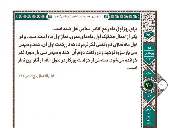 برای روز اول ماه ربیع‌الثانی دعایی نقل شده است. یکی از اعمال مشترک اول ماه‌های قمری، نماز اول ماه است. سید، برای اول ماه نمازی دو رکعتی ذکر فرموده که در رکعت اول آن، حمد و سپس سی بار سوره توحید و در رکعت دوم آن، حمد و سپس سی بار سوره قدر خوانده می‌شود. سلامتی از حوادث روزگار در طول ماه، از آثار این ...
