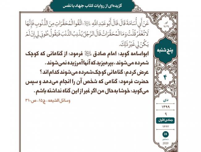 و حق زبان، گرامی داشتن آن از دشنام و عادت دادنش به خیر، و ترک یاوهای است که فائدهای در آن نیست، و نیکی کردن درباره مردم، و خوبی گفتار درباره ایشان است. و حقّ گوش، منزه داشتن آن از شنیدن غیبت، و از شنیدن چیزی که شنیدنش روا نیست. و حق چشم این است که آن را از چیزی که برای تو حلال نیست فروبندی و نگاه...